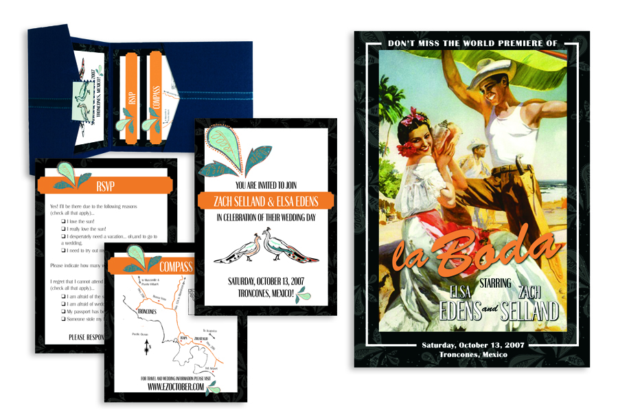The invitations for this destination wedding started with the vintage Mexican illustration which we made into a movie poster titled “The Wedding” for the save the date postcard. The pattern and colors were then carried over to the invitation pieces to create a bright and fun invitation suite.
